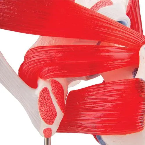 This model illustrates the right coxofemoral joint in a male; various muscles are visible, as well as the distal and proximal muscle insertion areas of the femur and ilium. For didactic purposes, the muscle surfaces of the distal and proximal areas are raised and colored differently (distal insertion = red; proximal insertion = blue). The various hip muscles are arranged on the respective surfaces of their distal and proximal insertions, which will allow them to be removed.