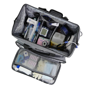 The large interior main space includes 8 pockets, 2 removable Velcro dividers, 1 zippered mesh pocket. With a very large two-way zipper opening, it provides easy access to diagnostic instruments and care equipment.