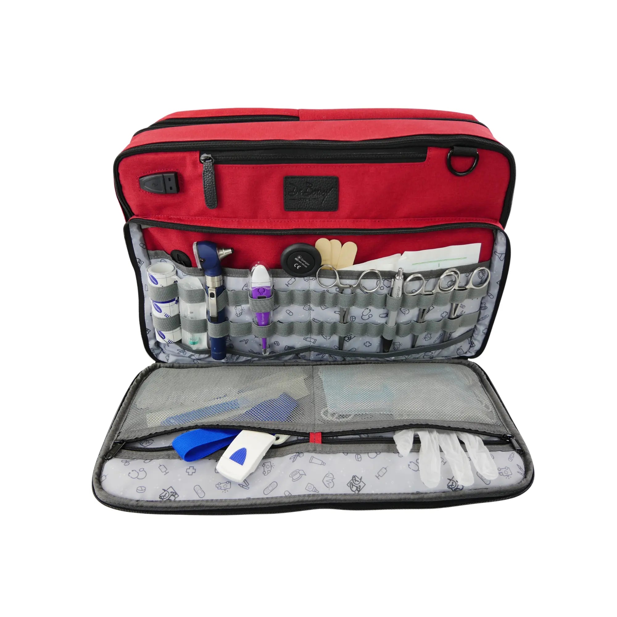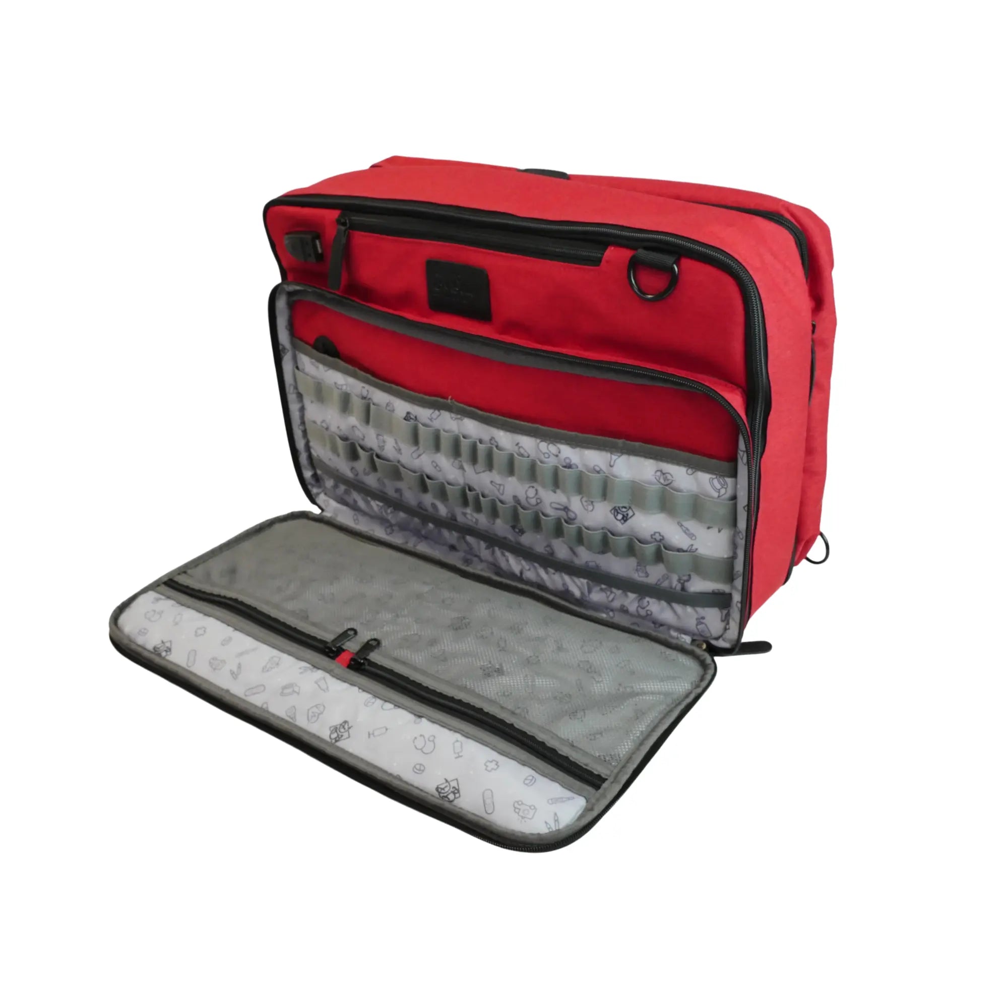Ce modèle a également la grande poche ventrale (45x21 cm) qui s’ouvre complètement avec d’un côté 2 filets de rangements zippés et 2 poches plates, et sur l’autre face plusieurs boucles élastiques qui permettent de ranger les petites fournitures de soins : pinces, ciseaux, lampe-stylo, thermomètre, bandages, stylos, etc…