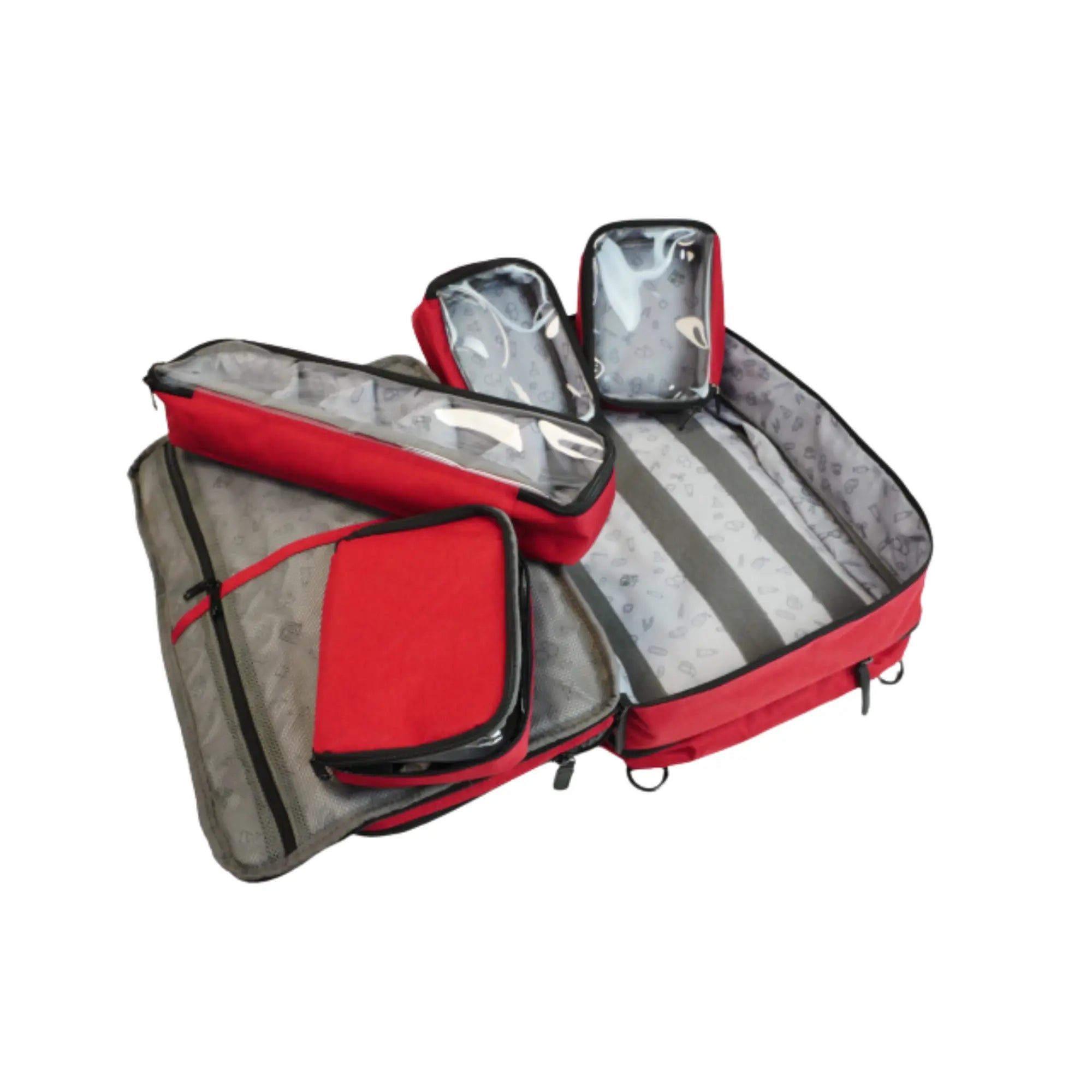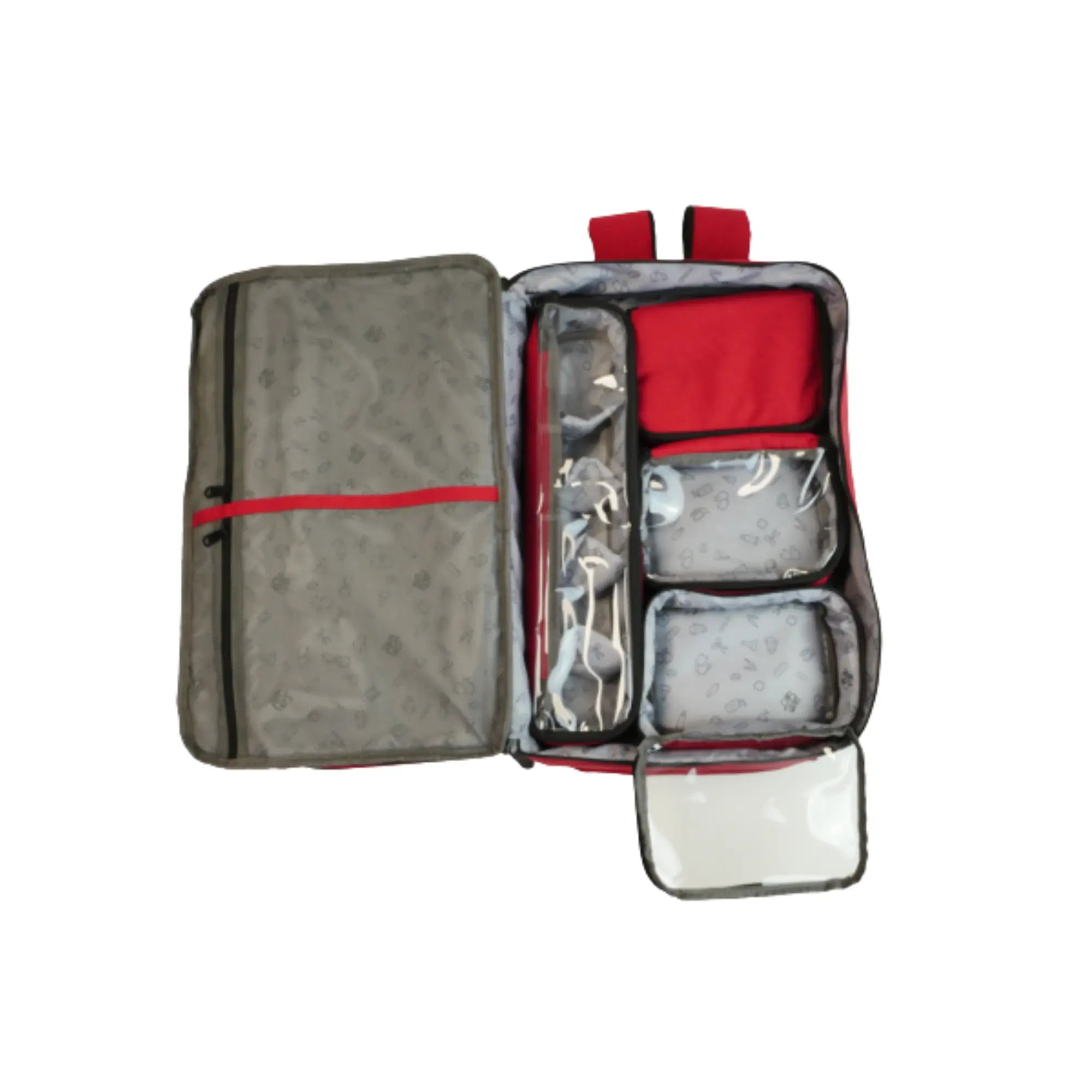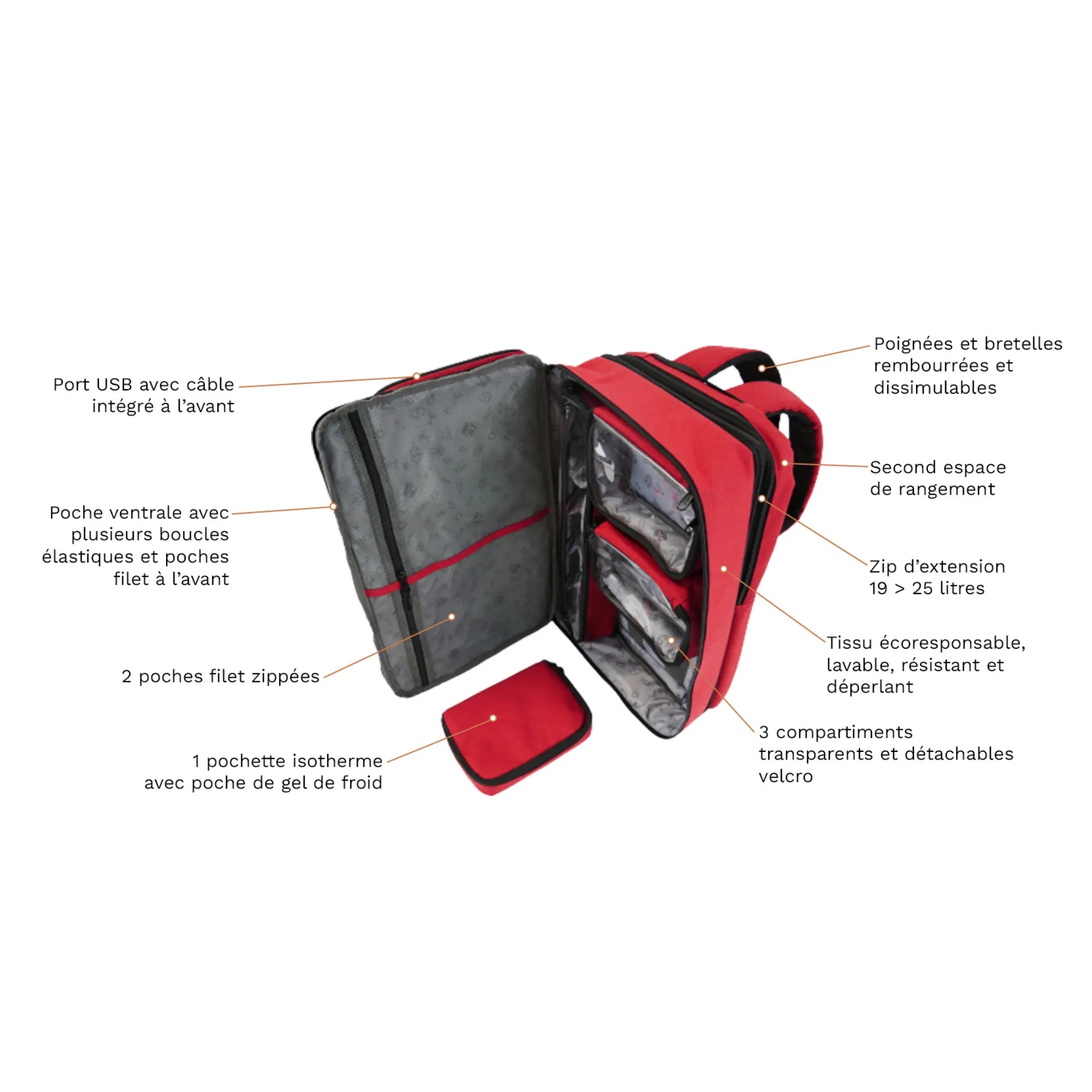 Son espace principal est modulable et contient 4 compartiments zippés, extractibles (fixés avec velcro) : 3 transparents pour identifier rapidement le contenu, et 1 isotherme, fourni avec sa poche de gel froid réutilisable, pour y glisser jusqu’à 20 ampoules