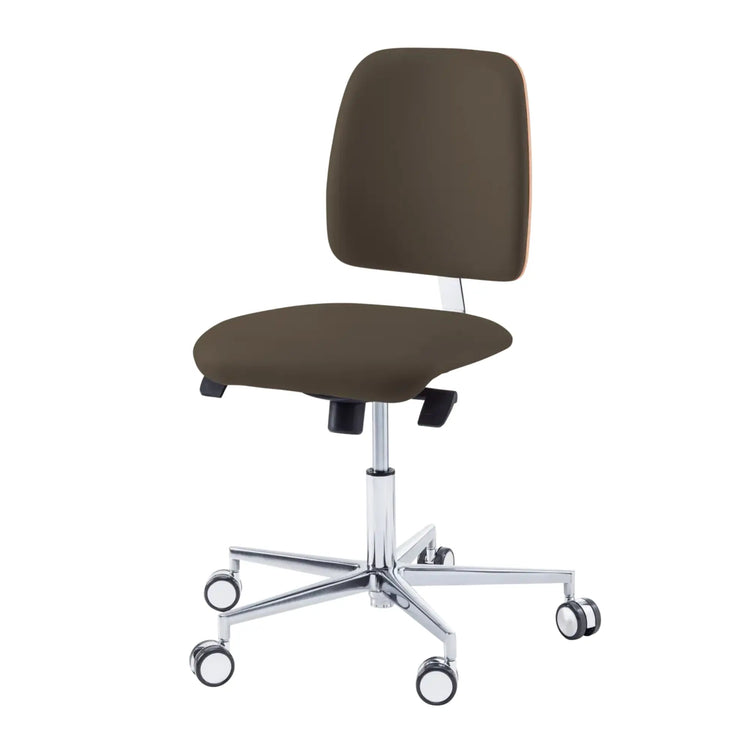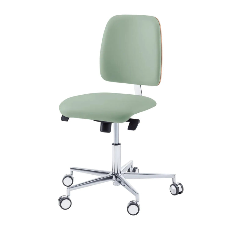 Tabouret avec assise agréable et rembourrée. Base en aluminium avec des roulettes auto-freinantes.